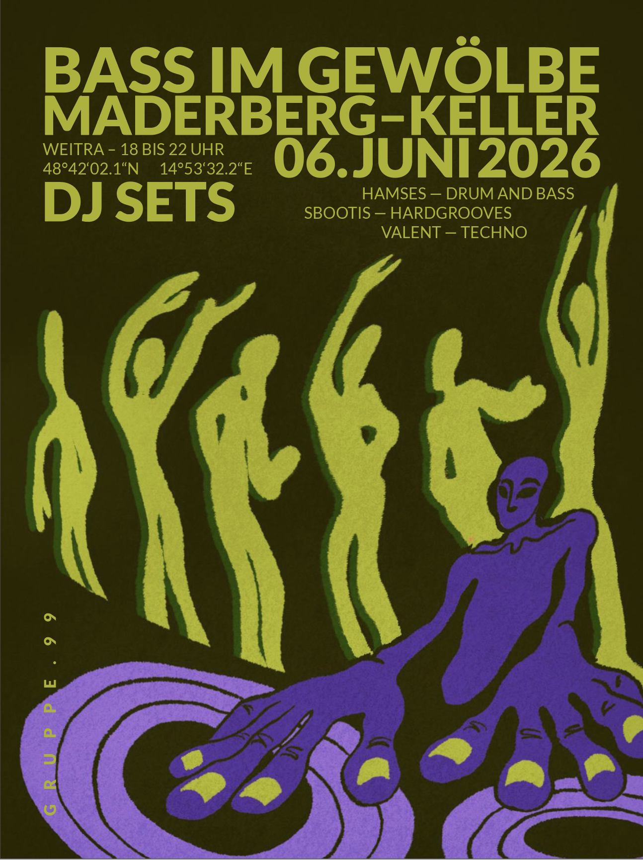 Mit „Bass im Gewölbe“ eröffnen wir den Sommer und laden zu einem Abend ein, der unter die Haut geht: Drei DJs bringen das Gewölbe zum Beben – mit Drum and Bass, Techno und Hardgrooves.